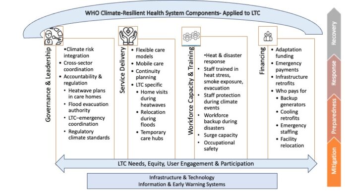 What makes this particularly troubling is not just the scale of the risk, but the policy blind spot that surrounds it. The World Health Organisation has developed two important frameworks: one for climate-resilient health systems and one for integrated long-term care. Neither references the other. Long-term care does not appear in climate adaptation strategies. Climate risk does not appear in care planning. The result is a sector left entirely at the margins of both agendas.