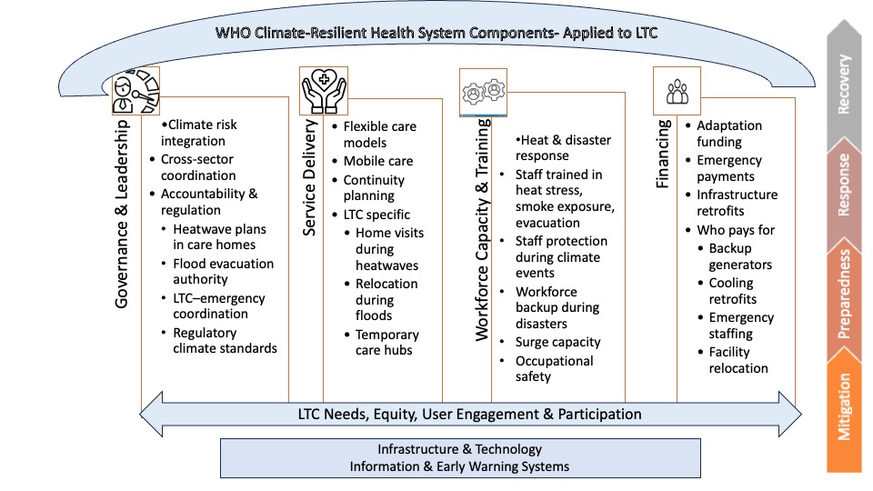 A paper I recently published in the journal Sustainability sets out to address this gap directly. Drawing on a horizon-scanning review of evidence from across high-income countries, the paper proposes a new framework that, for the first time, systematically integrates climate risk and adaptation into the architecture of long-term care (LTC) systems. For members of the MENARAH network, the implications are immediate and pressing.
